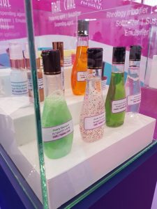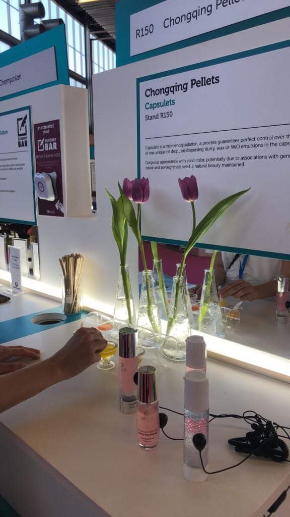 Vallitsevana teemana oli ympäristö ja ihmisen mikrobiologiaan perustuva kosmetiikka. Raaka-aineita oli aivan järjetön määrä. Olen erittäin iloinen ja innoissani kaikista uusista innovaatioista, joita raaka-ainepuolella on tulossa. Kuvissa vain muutamia esimerkkejä uutuuksista ja erilaisista teknologioista. Mukavaa miten moni yritys halusi tehdä vaihtoehtotuotteita muoville ja ympäristöä kuormittaville ainesosille. Biohajoava glitteri ja ympäristöystävällinen silika jäivät parhaiten minun mieleeni. Ehkä siksikin, että standit olivat vaikuttavia.