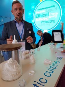 Ensimmäisenä päivänä melkein ensimmäinen asia minkä messuilta bongasin oli kermavaahdon näköinen purkki. Pakkohan siitä oli mennä kysymään, että mikä ihme tämä on. Kyseessä oli karitevoista tehty vaahto, joka ei sisällä yhtään vettä! Purkin kun käänsi ylösalaisin, se toimi kuin marenki: ei valu tai tipu! Muutenkin he vertasivat tuotteen kemiaa marenkiin; joukkoon lisätään tärkkelystä, jotta vaahto muodostuisi ja pysyisi. Kokeilin myös tuotetta, on muuten aivan ihana.